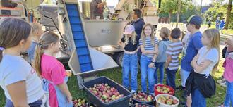 Einige Klassen der Grundschule Hallerndorf nutzten die Gelegenheit, die Arbeitsabläufe zu beobachten und sich die Arbeitsschritte erklären zu lassen. Besonders Spaß machte es natürlich, die Äpfel auf das Förderband zu legen. Mit großer Freude nahmen wir auch die Kostproben des frisch gepressten Saftes entgegen. Manche ließen sich den Becher sogar mehrmals füllen.