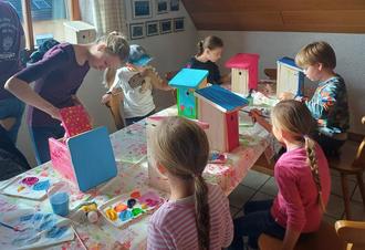 Nach Montage des Holz-Bausatzes malten die Kinder ihre Werke noch bunt an, bevor sie mit einer gemeinsamen Brotzeit für ihre Mühe belohnt wurden.