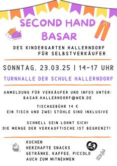 Der Basar wird am Sonntag, 23.03.25 in der Turnhalle der Grundschule Hallerndorf von 14.00 - 17.00 Uhr stattfinden.