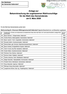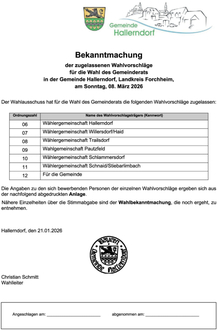Die zugelassenen Wahlvorschläge für die Landrats- und Kreistagswahl inkl. der Namen aller Bewerber können im Aushang am Rathaus Hallerndorf oder auf der Homepage des Landratsamtes Forchheim eingesehen werden.