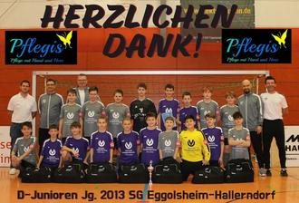 Die Trainer und Stammvereine der SG Eggolsheim-Hallerndorf bedanken sich recht herzlich bei Andreas Hellwage (im Bild stehend links), Geschäftsführer des Pflegedienstes „Pflegis“ aus Hallerndorf, für das Ausrüsten unserer Nachwuchsfussballer mit praktischen Jako Sporttaschen. Durch das Sponsoring trägt unser ehemaliger Torwarttrainer Andy zu einem einheitlichen Auftreten und Stärkung des Gemeinschaftsgefüges bei. Das obige Bild zeigt das Trainerteam mit unseren stolzen Nachwuchskickern samt neuer Taschen, nach dem Gewinn des Eggerbach-Hallencups in Eggolsheim.