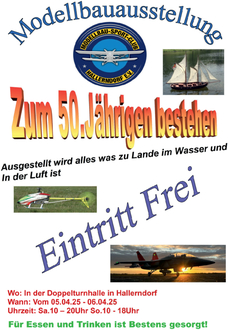 Zu diesem Anlass findet am Samstag, 05.04.25 von 10.00 – 20.00 Uhr und Sonntag, 06.04.25 von 10.00 – 18.00 Uhr in der Schulturnhalle Hallerndorf eine Modellbau-Ausstellung statt. Hier wird die gesamte Modellbaupalette des Vereins dargestellt.