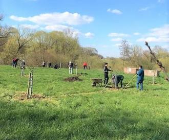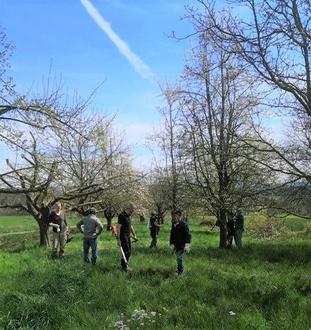 Fleißige Helfer trafen sich auf der gemeindeeigenen Streuobstwiese in Schlammersdorf, um die vor vier Jahren gepflanzten Bäume zu pflegen und mit Humus zu versorgen.