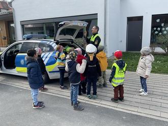 Begleitet von der Verkehrspolizei Herrn Fleischmann, übten die Vorschulkinder an Straßenkreuzungen, an Fußwegen und beim überqueren der Straße das richtige Verhalten. Besonders wichtig war dabei das Bewusste stehenbleiben, schauen und zuhören – denn Sicherheit geht immer vor.