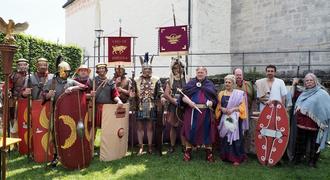 Im Gefolge hatten Kaiser Vespasian und Antonia Caenis einen Legionär und einen Optio. Der Optio, ein Unteroffizier mit zahlreichen Orden auf der Brust, erklärte den Besuchern die Ausbildung in der römischen Armee. Für die Kinder spielte er mit dem mitgebrachten Cornu, einem römischen Blasinstrument, auch kleine Musikstücke. Am Veranstaltungsende durften die Besucher, darunter Kreisheimatpfleger Dr. Christian Soika, sogar der Bayernhymne lauschen.