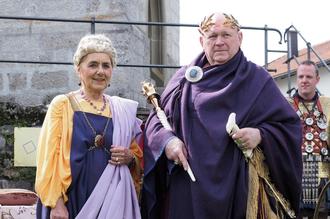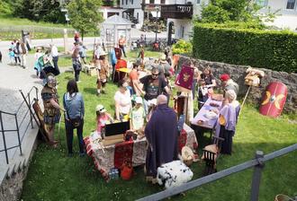 An der Museumskasse konnten sage und schreibe 189 Besucher gezählt werden, die den Familiensonntag für eine ausgiebige Entdeckungstour durch die Sonder- und Dauerausstellung im neugestalteten Museum nutzten. Bei schönstem Wetter gab es eine Menge rund um das Thema Geschichte zu erleben und ausprobieren. Das Highlight war natürlich eine „Audienz“ bzw. ein Gespräch mit dem Kaiser Vespasian, verkörpert durch Dietmar Kanert, dem Chef der Römergruppe COH II RAET aus Straubing. Kanert und seine Lebensgefährtin Margit sehen nicht nur aus wie die historischen Vorbilder Kaiser Vespasian und seine Geliebte Antonia Caenis, sondern haben die Rollen wirklich verinnerlicht. Es wurde sprichwörtlich aus den Näh- bzw. Schmuckkästchen des römischen Kaiserhofes geplaudert. „Von Prof. Dr. Günther Moosbauer, dem Direktor des Gäubodenmuseums in Straubing kam die Anregung und der Wunsch, den römischen Kaiser Vespasian und Antonia Caenis darzustellen“, erzählte Kanert auf Nachfrage. Die Ausstattung ist handwerklich von bester Qualität und exakt nach historischen Vorlagen gefertigt. Der Lorbeerkranz beispielsweise ist aus getriebener Bronze die nachträglich vergoldet wurde. Die Kleidung wurde extra für die Kaiserdarstellung gewebt und geschneidert.