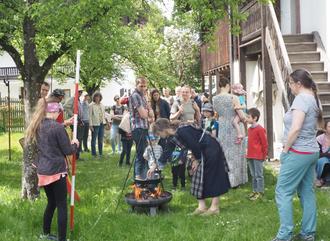 Seebruck/Römermuseum. Internationaler Museumstag 2. Teil des Berichts. Neben dem Museum lockte aber auch der Museumsgarten mit dem Obstanger zur Zeitreise. Hier konnten die Kinder mit Sabine Wastlhuber am offenen Feuer römisches Fladenbrot backen und interessante Fakten über die Lebensmittel der Kelten lernen. So erfuhren die Kinder z. B., dass die Kartoffel erst durch Christoph Columbus den Weg in unsere Kochtöpfe fand und die Kelten und Römer diese noch nicht kannten.