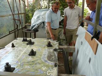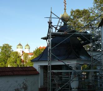 Letzten Freitag war es endlich soweit. Bürgermeister Martin Bartlweber, ein Redakteur vom Trostberger Tagblatt und ich konnten sehen, wie der aktuelle Stand der Restaurierungsarbeiten am lebensgroßen Nepomuk und der Eternitplatten des Grabes von Herzog Georg von Leuchtenberg sind. Viele werden schon bemerkt haben, dass dessen Grab von einem Gerüst umschlossen ist. Derzeit wird das Dach, das nach dem Befund von Herrn Herzinger in einem sehr guten Zustand ist, ausgebessert und neu gestrichen. Die Holzfenstereinfassungen daran sind marode und müssen erneuert werden. Um das Bildnis des Hl. Georgs (ist ebenfalls in Bearbeitung) entnehmen zu können, wurden die zwei großen Platten entfernt. Dabei mussten die Restauratoren feststellen, dass die Mauer dahinter damals mit einem Bitumenanstrich versehen wurde, wodurch sich die Nässe staute. Dieser wurde nun entfernt und die Mauer trockengelegt. Künftig werden die Platten so angebracht, dass die Luft dahinter zirkulieren kann und trocken bleibt. Die Figur des Hl. Nepomuk ist noch immer arg anzuschauen. Aber die Bestandsaufnahme ist gemacht und nun kann es nur gut werden. Leider haben sich im Inneren der Figur aus Lindenholz, nicht wie ursprünglich vermutet Eiche, Holzwespen eingenistet. Auch die vielen unsachgemäßen Ausbesserungen haben der geschichtsträchtigen Figur sehr geschadet. Aber bei Quirin und Josef Herzinger ist sie in den besten Händen. Ich werde über die Fortschritte der Restaurierung weiter berichten.