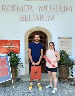 Am Donnerstag, den 11. August 2022 konnte Museumsleiter Matthias Ziereis die beiden 3000sten Besucher im Römermuseum der Gemeinde Seeon-Seebruck in diesem Jahr begrüßen. Herr Adrian R. aus Landsberg und seine Begleiterin Maria machten auf ihrer Radltour um den Chiemsee Station im Römermuseum. Als Lateinlehrer ist die Begeisterung für die Römer fast schon berufsbedingt vorhanden und so freuten sie sich auch einmal die Spuren der Römer am Chiemsee zu erkunden. Von der Gemeinde erhielten die beiden einige Präsente als Geschenk. Unter anderem die Münzreplik eines Gold-Aureus des Kaisers Hadrian. Die beiden waren besonders begeistert von der Sonderausstellung „Legionäre in Bedaium“ und versprachen, dass dies nicht ihr letzter Besuch im Seebrucker Museum sein werde.