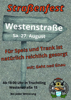 Der Burschenverein Ising-Truchtlaching veranstaltet wieder das Westenstraßenfest. Mit Essen, Trinken, Livemusik und Bar ist für das leibliche Wohl auf jeden Fall gesorgt.