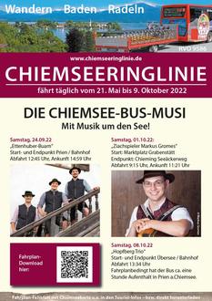Die Chiemseeringlinie bringt noch bis 9. Oktober 2022 mehrmals täglich Radfahrer und Wanderer rund um den Chiemsee. Ein besonderer Höhepunkt in diesem Jahr ist die Veranstaltungsreihe „Chiemsee-Bus-Musi“, die bereits zum Auftakt im Mai stattfand und die Chiemseeringlinien-Saison nun auch beschließen wird.