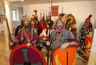 Matthias Ziereis und Dirk Eggenweiler, beides begeisterte historische Darsteller, präsentierten sich in der Ausrüstung von römischen Soldaten. Mit Historiker Marcus Altmann sind sie auch Kuratoren der Sonderausstellung 2022 „Legionäre in Bedaium“ im Römermuseum.