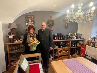 Natürlich kam auch Bürgermeister Martin Bartlweber zum Gratulieren vorbei. „Jeder kennt die Wein-Resi. Und wer nicht, der sollte es nachholen. Sie ist wirklich ein besonderer Mensch, der sich immer für andere eingesetzt hat und jeden mit ehrlicher Herzlichkeit empfängt. Ich hoffe ihr kleiner Weinladen bleibt uns noch lange erhalten und wünsche Resi Meier alles Gute.“