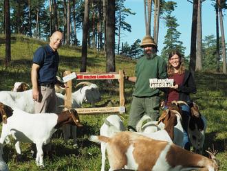 Foto: Michael Karmann, Bürgermeister von Buttenheim und 1. Vorsitzender des LPV Bamberg, Beweider Jörg Schmitt und Julia Eberl, Geschäftsführerin des LPV Bamberg, weisen mit einem Holzrahmen am Amstling bei Tiefenhöchstadt auf die Bedeutung der Landschaftspflege hin.
