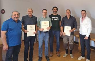 Hans Nüsslein, Erhard Aheimer und Markus Neubauer blicken auf jeweils 25 Arbeitsjahre im öffentlichen Dienst zurück. Grund genug, dass die drei 1. Bürgermeister Thomas Betz, Norbert Grasser und Volker Will zu einer kleinen Feierstunde in den Sitzungssaal einluden, um die Glückwünsche zu überbringen und ein großes Lob und den Dank für die wertvolle Arbeit, die gute Zusammenarbeit, die Zuverlässigkeit und die Einsatzbereitschaft der Jubilare auszusprechen und eine Dankurkunde des Freistaates Bayern und der VG Steinfeld zu überreichen.