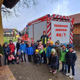 Nicht schlecht staunten die Eisbären, als Carina G., zweite Kommandantin von der FFW Arnstein samt Feuerwehrauto zu einem Lerneinsatz in den Kindergarten kam.