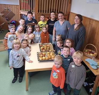 Die Eisbären luden sich M. und M. Scheumann und L. Betz von den Arnsteiner Gartenfreunden in den Kindergarten ein und gestalteten einen Vormittag zusammen. Eine Fantasiereise stimmte die Kinder auf das Obst des Tages ein. Danach ging es schon tatkräftig an´s Werk, und jeder bereitete seinen Apfel vor. Danach rührten M. Scheumann mit den Kids die Füllung zusammen und L. Betz unterstütze beim Mahlen der Nüsse. Nachdem alle Äpfel fertig waren und im Ofen brutzelten, malten die Kinder einen Bratapfel aus.