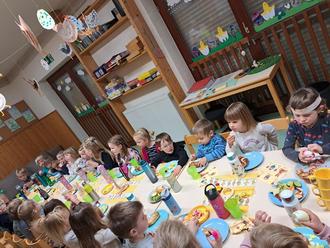 Nach einer kindgerechten Aufarbeitung der Jesusgeschichte gestalteten die Kinder bildlich die Stationen der Ostergeschichte. Anschließend ließen es sich alle beim Osterfrühstück festlich schmecken. Die Spannung stieg zunehmend: „Ob wohl der Osterhase auch in diesem Jahr zu uns kommt?“ Nicht schlecht staunten dann alle, als er für jedes Kind ein vom Elternbeirat so liebevoll gestaltetes Nest vorbeibrachte.