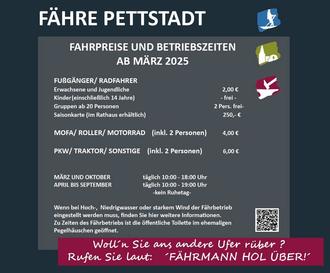 Bei Niedrig- bzw. Hochwasser oder starkem Wind muss der Fährbetrieb eingestellt werden. Solch ein Zustand kann leider auch kurzfristig eintreten. Weitere Infos dazu und Umfahrungsmöglichkeiten finden Sie auf www.pettstadt.de/faehre