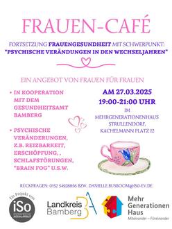 Ganz besonders freue ich mich, dass Frau Alexandra Hölzlein vom Gesundheitsamt Bamberg wieder dabei sein wird und uns durch den Abend begleitet. Unsere Absicht ist aufzuklären und die Selbstwahrnehmung bei Veränderungen im Hinblick auf mögliche Wechseljahre ernst(er) zu nehmen. Das ist vor allem wichtig, um Ärzten entsprechende Fragen zu stellen zu können. Je früher wir aufgeklärt gegensteuern (sei es hormonell und/oder über einen gesunden Lebensstil sowie Naturheilkunde), umso mehr Chancen haben wir, positiven Einfluss auf den Verlauf und auf spätere Erkrankungen auszuüben und unsere Gesundheit zu stärken UND darüber hinaus unsere Erfahrungen an unsere Töchter weiter zu geben. Weg mit der Angst und dem Tabu, hin zu mehr Wissen, Selbstfürsorge, Zuversicht und Selbstbewusstsein! (Einladung zum „Frauen-Café“ siehe Flyer: 27.03.2025, 19:00 Uhr).