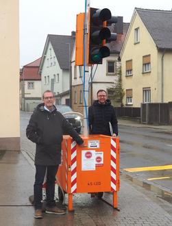 Bürgermeister Wolfgang Desel und Bauamtsleiter Jens Müller machen sich ein Bild über die neue Ampelanlage.