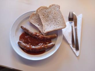 Schaschlik Bratwurst mit frischem Weißbrot vom Bäcker Dresel. Die Soße für die frischen Bratwürste hat Hildegard gezaubert. Und die hat so gut geschmeckt.
