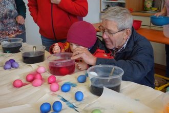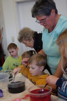 Natürlich wurden echte einheimische Bio-Eier gefärbt und bemalt. Die Osterhasenwerkstatt war voll besetzt. Ein voll gefülltes „Osternest“ war der verdiente Lohn. Auch Papas und Mamas, Opas und Omas freuten sich mit den kleinen „Osterhasen“.