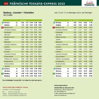 Ab 1. Mai dreht der „Fränkische-Toskana-Express“ (Linie 970) am Wochenende und Feiertagen wieder seine Runden. Von Bamberg Bahnhof aus geht es über Strullendorf und Tiefenellern nach Litzendorf und zurück nach Bamberg, mit zahlreichen Haltestellen. Perfekt für alle Ausflügler, die direkt ins weitläufige Wandergebiet kommen wollen. Wer länger im Bierkeller sitzen bleibt, kommt mit der neuen Buslinie bequem und sicher zurück nach Bamberg zum Bahnhof.