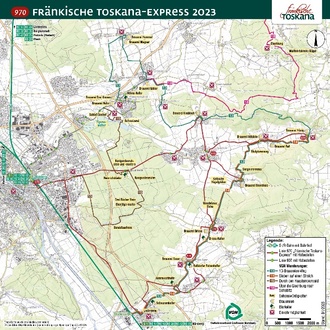 Umwelt- und klimafreundlich zum Wandern - die 2022 eingeführte VGN-Freizeitlinie „Fränkische Toskana Express“ (Nr. 970) fährt ab 1. Mai wieder Wanderer und Ausflügler von Bamberg aus in die Fränkische Toskana und zurück. Selbstverständlich profitieren auch Einheimische von den besseren Busverbindungen an Wochenenden und Feiertagen zwischen den Dörfern und zu den Anschlusszügen ab Bamberg in das VGN-Einzugsgebiet. Alle Informationen zur VGN-Freizeitlinie gibt es unter www.fraenkische-toskana.com.