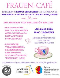 Nachdem unsere Reihe „Frauen-Café“ zur Frauengesundheit im November 2024 startete und mit 17 Damen gut besucht war, bestand der auf Wunsch auf Fortsetzung. Beim letzten Themenschwerpunkt „Wechseljahre“ standen körperliche Veränderungen im Vordergrund. Dieses Mal schauen wir uns die psychischen Veränderungen an, die bei den Wechseljahren einher gehen und wie diese sich sowohl auf die Persönlichkeit als auch auf das Miteinander (Partnerschaft, Familie, Beruf usw.) auswirken können.