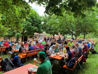 Start war in Lohndorf auf dem Kunst- und Besinnungsweg, den der lokale Künstler Robert Hoffmann geschaffen hat. Die Kunst in der Landschaft soll sowohl "Denkanstoß als auch Nährboden für Gedanken und kreative Prozesse sein" erklärt der Künstler. Bei der Skulptur der Sieger geht's ab auf den 13-Brauereien-Weg, der im Ellertal zur Brauerei Hönig nach Tiefenellern führt. Im lauschigen Biergarten der 1478 gegründeten Brauerei haben wir Mittagsrast gemacht. Von hier meldete sich Bayern 1 Moderator Stefan Straßer LIVE in die Sendung „Mittags in Franken“, während sich die Wanderer die verschiedenen Biere schmecken ließen.