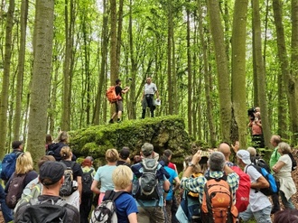Frisch gestärkt führt die Strecke steil hinauf zur keltischen Wallanlage am Schlossberg und weiter zur Jungfernhöhle. Ein Sagenerzähler berichtete den Wanderern die schaurige Geschichte, wie die Höhle zu dem Namen kam. Nach dem Aufstieg lockt die Aussicht über das Ellertal vom Eulenstein, einem mächtigen Felsen hoch über dem Tal. Über den ehemaligen Steinbruch von Tiefenellern sind wir dann zurück nach Lohndorf gewandert, wo uns der Biberberater bereits am Biberrevier erwartete. Ziel der Wanderung war die Skulptur der Sieger. Ein Mann, der freudig die Arme in die Luft streckt. Das trifft sicher genau das Gefühl nach dieser Wanderung. Von hier meldete sich BR Korrespondentin Sandra Jozipovic LIVE in die "Frankenschau aktuell" im BR Fernsehen.