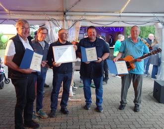 Schwerpunkt der beiden Jubiläen der Sportgemeinschaft Brüder am Forst war neben einem kurzen Rückblick auf die Vereinsgründung als Geselligkeitsverein 1905 und der Umwandlung in eine Sportgemeinschaft 1971 die Anerkennung der vorbildlichen Kinder- und Jugendarbeit im Verein. Als „Gründungsväter“ wurden Ludwig Werner und Franz Will für 50 Jahre praktisches und beratendes Engagement besonders gewürdigt. Wolfgang Will machte sich fast 40 Jahre um die Jugendarbeit verdient. 2. Vorsitzender Lothar Kossmann zog ein Fazit über diese Zeit. Die ersten 20 Jahre der Schüler- und Jugendarbeit in Roßdorf und Wernsdorf tragen zweifelsohne den Stempel von Ludwig Werner und Franz Will. Ihre Ideen, Jugendarbeit für und mit jungen Menschen zu gestalten, haben viele geprägt. Dass es dabei, vor allem beim SV Wernsdorf, galt, „Mauern“ einzureißen, wissen beide nur zu gut. Nicht nur der sportliche Erfolg stand im Vordergrund, sondern junge Menschen in ihrer persönlichen Entwicklung zu unterstützen.Es lässt sich vieles nicht vollständig aufzählen, doch es bleibt hoffentlich in der Erinnerung aller „Beteiligten“. Manches Tun mag man aus heutiger Sicht in Frage stellen, damals war es (fast immer) richtig. Wer erinnert sich noch an jährliche Abschlussfeiern der Schülermannschaft in der Garage, im Garten oder Schulplatz? Meist gab es gebratene Hähnchen von Elli. Wer erinnert sich noch an den ersten Pokalgewinn, der traditionell mit etwas Sekt im Wohnzimmer von Franz gefeiert wurde. Jeder durfte einmal nippen. Dafür wurde Franz von der Wirtin Elisabeth Sauer der Kopf gewaschen. (Verführung von Kindern zum Alkohol. )Wer erinnert sich noch an Jugend-Discos im Vereinshaus Wernsdorf? (Security – Man Dieter Schick) (Getränke mussten vom SV Wernsdorf zum vollen Preis bezogen werden.) Wer kennt noch das „Alte Haus von Rocky-Docky? (Abgerissen gegenüber dem Kleehof, einst Besitz der Familie Essel)) Schäuferla-Essen im Nebenzimmer vom Schiller? (Winni als „Oberkellner“ mit unglaublichen Kopfrechenkünsten.) Danke allen, die die Fackel Jugendarbeit weiter getragen haben und stolz auf 50 Jahre zurückblicken können. 1. Bürgermeister Wolfgang Desel, BLSV Kreisvorsitzender Carsten Joneitis und Kreisjugendleiter Udo Schoberth würdigten das Vereinsleben der Sportgemeinschaft, das durch viele stille Stars das Dorfleben prägt. Freude bereitete vor allem allen jungen Festbesuchern die Spielestraße, die von Laura Will und ihrem Team erstmals organisiert wurde. Die Hüpfburg des Kreisjugendringes war immer belegt. Beim 11 Meter Schießen und am Fußball-Dart konnten Sportlerinnen und Sportler ihr Können beweisen. Dank der Arbeit fleißiger Helfer in der Küche und hinter der Theke war das Jubiläum ein tolles Familienfest. Der „Feierabend“ erinnerte an einstige Discozeiten.