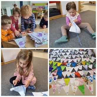 Ein weiteres Highlight war die AWO-Wimpelaktion „Wimpel für Wandel“, bei der die Kinder kreativ vielfältige Wimpel gestalteten und diese an die Sozialministerin Ulrike Scharf weiterleiteten, um bei der Überarbeitung des Bayerischen Kinderbildungs- und Betreuungsgesetzes der Staatsregierung bessere Bedingungen in Kitas anzustoßen. Auch wir als Kinderhaus „Sonnenschein“ haben uns an dieser Aktion begeistert beteiligt und über 250 Wimpel abgeben.
