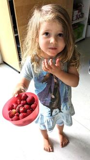 Die kleine Leah zeigt stolz ihre Erdbeer-Ernte!