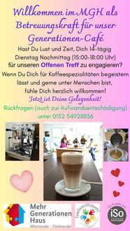 Unser Dienstag OT Mehrgenerationen-Café findet nach den Ferien wieder regelmäßig statt ab 24.06.2025 zwischen 15:00 und 18:00 Uhr. Eine Anmeldung ist nicht erforderlich. Fühlt Euch herzlich willkommen und genießt eine Atmosphäre des Miteinanders und Füreinanders!