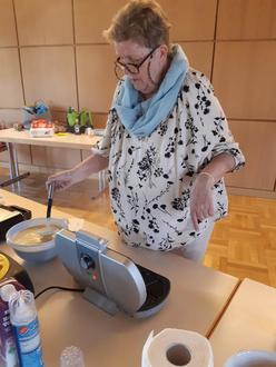 Diesmal war kein Geburtstag zu feiern also feiern wir uns einfach selbst. Denn wir sind eine fröhliche, aufgeschlossen Gruppe, die jeden Freitag mit guter Laune und voller Elan zusammenkommt. Und diesmal gab es zum Kaffee keinen Kuchen, sondern frisch gebackene Waffeln. Dazu lecker Eis, Erdbeeren, Bananen oder Pfirsiche verziert mit Sahne. Oh, da wurde geschlemmt und wir konnten gar nicht genug bekommen von dieser außergewöhnlichen Schlemmerei.