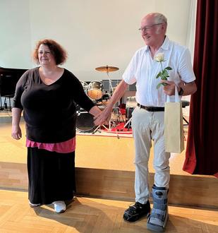 Den Anfang machte Michael Schneider mit der Trompete. Versiert musizierte er „The Enchanted Trumpet“ von Allen Vizzutti. Es folgte das italienische Volkslied „Ciao, Bella, Ciao“, sicher und mit schöner Tongebung vorgetragen vom jungen Saxophonist Philipp Nüßlein. Aus dem Fachbereich Gesang wurden zwei Beiträge dargeboten. Jana Kohlmann verzauberte das Publikum mit „Someone like you“ aus dem Musical „Jekyll & Hyde“. Elisabeth Wiesen interpretierte gekonnt „Eja Mater“ von G. B. Pergolesi. Dass auch die Blockflöte ein wunderschönes Konzertinstrument ist, bewies Amelia Wrensch mit zwei Liedern aus Irland, die sie souverän auf ihrem Instrument zu Gehör brachte. Michael Schneider war nun noch einmal mit zwei Klavierstücken zu hören. Mitreißend und schmissig spielte er den „New Orleans Blues“ von W. Gillock und ein „Pop-Prelude“ von D. Hellbach. Auf der Klarinette überzeugte Elena Scheuring mit einem „Prelude“ von Witold Lutoslawski. Das moderne Werk präsentierte sie rhythmisch sicher und mit schönem Klang. Laura Prechtel gefiel zum Abschluss des Konzertes mit den beiden Stücken „Arcturus“ (H. A. Vandercook) und „Holidy Rock“ (K. Thielemann), die sie auf der Trompete musikalisch und begeistert spielte. Die Musikschulleiterin Margit Graf bedankte sich mit Blumen bei allen Solistinnen und Solisten, bei den Lehrkräften der verschiedenen Fachbereiche und bei der Korrepetitorin für diesen kurzweiligen und wunderschönen Konzertabend. Ein ganz besonderer Dank an diesem Abend galt dem ehemaligen Musikschulleiter Karl Berberich. Seit 2015 unterrichtete er weiterhin an der Musikschule im Fachbereich Trompete. Zum Ende des Schuljahres verlässt Karl Berberich nun die Musikschule und genießt seinen wohlverdienten Ruhestand. Margit Graf bedankte sich bei Karl Berberich mit Blumen und einem kleinen Präsent für