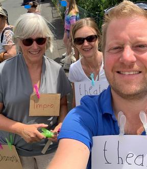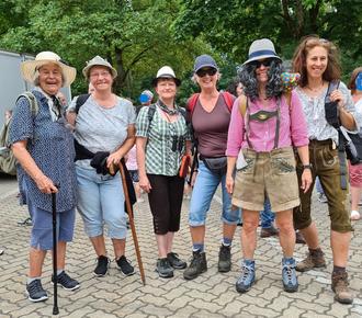 Lustige Wanderoutfits mit „Bundspecht“ zeigten die Wanderfreudigen, angeführt von Ulli Desel, die man aufgrund ihrer Verkleidung erst beim zweiten Hinsehen erkennen konnte. Und drei Theaterleute hatten die Theaterwerkstatt-Schlagworte als Zettel an sich befestigt. Ursprünglich hingen sie an einem Schirm, doch der starke Wind erforderte eine neue Art der Präsentation ihrer Vielseitigkeit. Wie schön, dass Ihr zwei Gruppen mitgelaufen und damit auch das MGH repräsentiert habt!