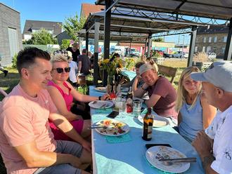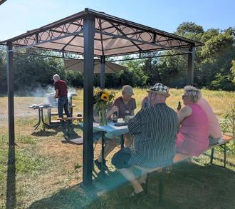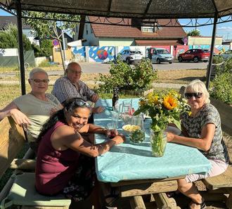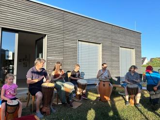 Am vergangenen Samstag, als die Hitze „so gerade noch erträglich“ war und ein gelegentlicher Windhauch hoffnungsvoll für minimale Abkühlung sorgte, feierten insgesamt 20 Erwachsene und 3 Kinder das jährliche Sommerfest für ehrenamtlich Engagierte des Mehrgenerationenhauses. Jede/r brachte etwas zum Sommer-Picknick mit und es entstand ein einladendes Buffett, passend zu den knusprigen Steaks, Würstchen, den gegrillten Zucchinis dem Grillkäse. Bei kühlen Getränken an geschmückten Tischen, genoss man einen gemütliches Beisammensein. Gegen Abend wurde es laut: der Offene Musik Treff (OMT) trommelte fetzige Rhythmen und wer mochte, konnte sich (teils zum ersten Mal im Leben) an einer Trommel oder einem Percussion Instrument ausprobieren. Ob der OMT dadurch neue Teilnehmende gewinnen konnte, wird sich zeigen. Auf jeden Fall hatten alle sehr viel Spaß, sowohl die Erwachsenen als auch die Kinder.