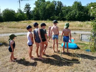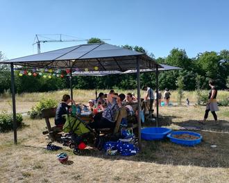 Endlich war es nicht zu heiß oder zu frisch, ein optimales Wetter, um unsere neue Wasserrutsche auszuprobieren. Begeistert stellten sich die Kinder im Offenen Treff an und hatten großen Spaß. Durch das keilförmige Kissen, das die Rutschpartie auf unserem kleinen Hang noch etwas steiler gestaltet, kamen die Kinder schnell in Fahrt und kreischten vor Freude und Erfrischung. Die Eltern ruhten sich im Schatten in geselliger Runde aus bei Eiskaffee, Latte, Cappuccino oder einem Kaltgetränk. Anschließend halfen einige Kinder dabei, den Garten zu gießen. Es war wieder einmal ein sehr schöner Nachmittag im OT.
