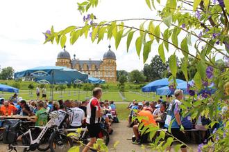 Bei strahlendem Sonnenschein und unter Dudelsack-Begleitung der „Glen Regnitz Pipe Band“ fuhren die fast eintausend Radler der BR-Radltour in Schloss Seehof ein. Bürgermeister Gerd Schneider begrüßte die hungrigen Radfahrer in der Fränkischen Toskana und lud sie herzlich ein in dem Wahrzeichen der Gemeinde Memmelsdorf eine wohlverdiente Rast einzulegen. Bestens unterhalten vom Musikverein Memmelsdorf und den MCC Tanzmäusen stärkte sich die Radler Schar bei fränkischen Spezialitäten, frisch zubereitet von der MV Gastronomie / Café-Restaurant Schloss Seehof. Wer den Daheimgebliebenen ein originelles Stück Schloss Seehof schicken wollte, konnte dies am Stand der Tourist-Information Fränkische Toskana tun - eine eigens kreierte Postkarte fand großen Absatz und wurde gegen das Portoentgelt sofort verschickt.