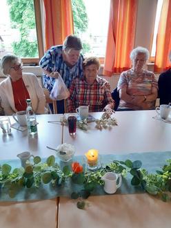 Da war doch schon wieder ein Geburtstag zu feiern. Unsere Elisabeth hat leckere Torten, Hörnchen und Kuchen „aufgefahren“ und wir haben bei Kaffee geschlemmt und die Zeit zusammen genossen. Eine fröhliche „Orgelmusik“ (kleine Leierorgel von Brigitte) und ein fröhlicher Kanon werden für Elisabeth dargebracht. Da freut sich das Geburtstagskind und hört auch gerne dem Gedicht von Helga zu. Es war eine rundum schöne Feier.