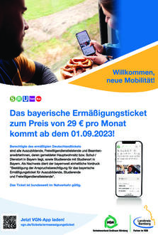 Der VGN bietet ab 1. September 2023 für Auszubildende, Freiwilligendienst-leistende und Beamtenanwärterinnen und Beamtenanwärter das ermäßigte Deutschlandticket für nur 29 Euro im Monat an, bestellbar ist das Ticket bereits seit dem 1. August 2023. Für Studierende mit Sitz ihres Studienortes in Bayern beginnt der Vorverkauf im September, das ermäßigte Deutschlandticket kann dann ab dem 1. Oktober 2023 (Wintersemester 2023/24) genutzt werden.