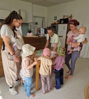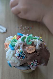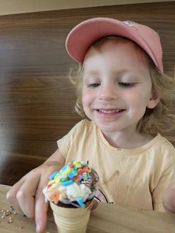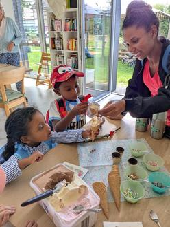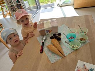 Mit freudiger Erwartung stürmten die Kinder an diesem Tag in den Offenen Treff: Waffelhörnchen (mit und ohne Schokolade) und verschiedene Schälchen mit Liebesperlen, Zucker-Buchstaben, Schokoladendrops, Mini-Keksen u. anderen Süßigkeiten, standen schon auf dem Tisch bereit. Am letzten Treffen vor der Sommerpause durften sie ihr Eis selbst heraus löffeln und nach Lust und Laune dekorieren. Für die kleinen Naschkatzen war es zum Teil eine Geduldsprobe aufeinander zu warten, bis sie endlich ihr Hörnchen verzieren durften. Jedoch das meisterten sie ihres jungen Alterns entsprechend erstaunlich gut. Ihre süßen kleinen Naschereien, liebevoll dekoriert, schmolzen rasch dahin. So musste das kleine Kunstwerk schnell in einem Erinnerungsfoto festgehalten werden. Für die Eltern gab es Eiskaffee, Affogato und alles, was unsere Siebträgermaschine so zaubert. Dazu naschte man holländische Kekse und zwei Mädchen machten Popcorn (das dann ohne Zucker!). Unser Spielhäuschen draußen und die Rutsche konnten, Dank des Wetters, in das freie Spiel mit einbezogen werden. Drinnen erfreuten sich die Kinder an den Rollfahrzeugen, Bilderbüchern, der Holzrutsche, der Kinderwippe und an dem schönen, bunten Schaukel-Elefant.