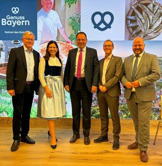 Auszeichnung des 13-Brauereien-Wegs im Landkreis Bamberg im Bayerischen Staatsministerium für Ernährung, Landwirtschaft, Forsten und Tourismus in München. Von links: Bürgermeister Wolfgang Möhrlein (Litzendorf), Tourismusmanagerin Bianca Müller, Staatssekretär Martin Schöffel, Bürgermeister Wolfgang Desel (Strullendorf), MdL Holger Dremel.