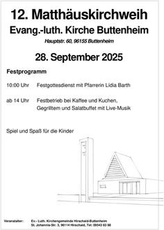 | Ab 14:00 Uhr | Festbetrieb mit Kaffee und Kuchen, Gegrilltem und Salaten sowie Live-Musik und Spielstraße vor der Matthäuskirche Buttenheim |