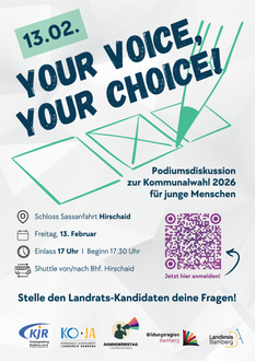 Unter dem Motto "Your Voice, Your Choice!" laden Kreisjugendring Bamberg-Land, Kommunale Jugendarbeit, Jugendkreistag und Bildungsregion Bamberg junge Wählerinnen und Wähler im Landkreis Bamberg zu einer Podiumsdiskussion ein. Dort haben alle jungen Menschen die Möglichkeit, den Landrats-Kandidaten im Vorfeld zur Kommunalwahl 2026 ihre Fragen zu stellen und in direkten Kontakt mit den Politikern zu treten.