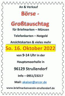 Am Sonntag, den 16. Oktober 2022 von 9.00 Uhr bis 14.00 Uhr findet der GTT in der Hauptsmoorhalle in Strullendorf bei Bamberg statt. Mit über 120 Mitglieder ist die BSG Strullendorf einer der größten Philatelistenvereine in Bayern.