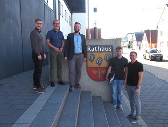 Zufriedene Gesichter nach der Vertragsunterzeichnung Von links nach rechts: Marcel Boiger, Kommunalberater Bayernwerk, Bürgermeister Wolfgang Desel, Tobias Eckardt, Projektleiter für die Kommunale Wärmeplanung, sowie Elias Kufner und Jens Müller vom Strullendorfer Bauamt.